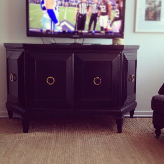 My vintage credenza was finally delivered!  I can't find a good "before" picture but image a very unattractive brown wood.  I had the piece stripped then stained ebony--I wanted it to have a Jacques Adnet feel so I added some blinging brass ring pulls in the center of the doors.
